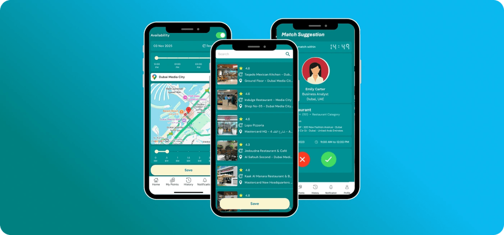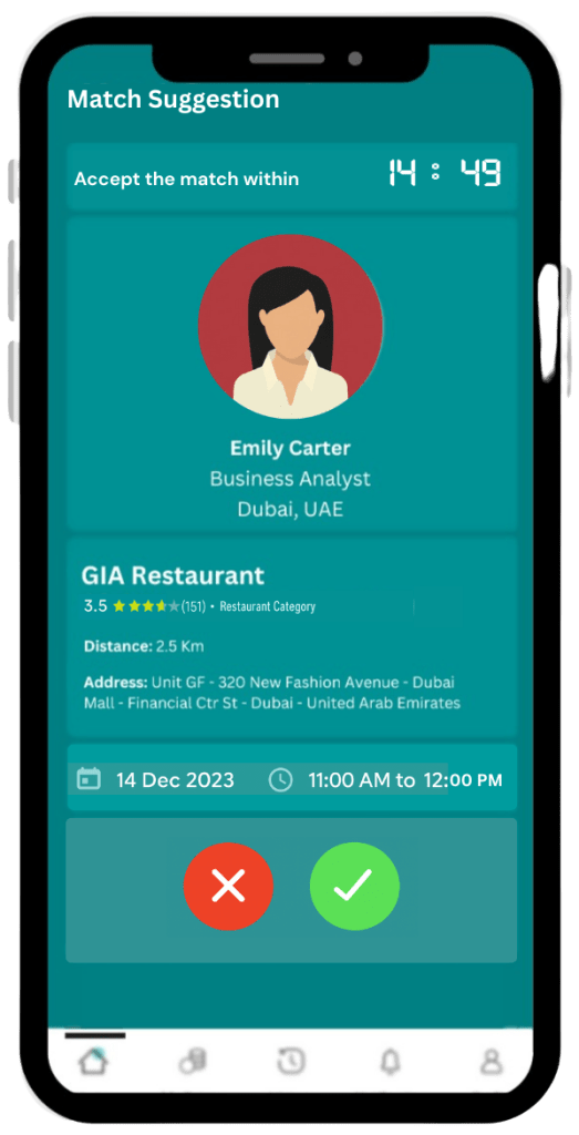 Select the range of time you are available for and the preferred dining places within your area. Our smart algorithm pairs you with a professional who shares your interests and schedules a lunch at a nearby venue.